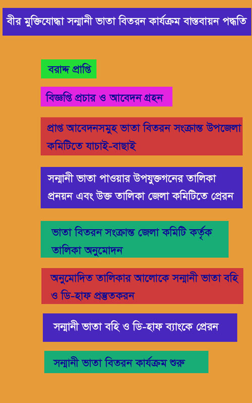 | বীর মুক্তিযোদ্ধা সম্মানী ভাতা | মাসিক ১০,০০০/- টাকা হারে মুক্তিযোদ্ধা সম্মানী ভাতা ও অন্যান্য আর্থিক সহায়তা প্রদান | লাল মুক্তিবার্তা, ভারতীয় তালিকা অথবা গেজেটভুক্ত বীর মুক্তিযোদ্ধা এবং মৃত অনুরূপ বীর মুক্তিযোদ্ধার স্ত্রী বা সন্তান | সর্বোচ্চ তিন মাস | ১. নির্ধারিত ফরমে আবেদন ২. জাতীয় পরিচয় পত্রের সত্যায়িত ফটোকপি ৩. পাসপোর্ট সাইজের ছবি ৪.মুক্তিযুদ্ধে অংশগ্রহণের সকল প্রমাণক-১ সেট। ৫.মুক্তিযোদ্ধার স্ত্রীর ক্ষেত্রে স্বামির এবং সন্তানের ক্ষেত্রে পিতা-মাতার মৃত্যু সনদের কপি। ৬.মুক্তিযোদ্ধার স্ত্রী এবং সন্তানের ক্ষেত্রে চেয়ারম্যান/ মেয়র কর্তৃক ওয়ারিশ সনদ। ৭.সন্তানের ক্ষেত্রে একাধিক ওয়ারিশ থাকলে একজনকে ভাতা উত্তোলনের ক্ষমতা প্রদান করে ৩০০ টাকার নন-জুডিশিয়াল ষ্ট্যাম্পে এফিডেভিটকৃত স্বীকৃতিপত্র। ৮.মুক্তিযোদ্ধার স্ত্রীর ক্ষেত্রে দ্বিতীয় বিবাহ করেননি মর্মে চেয়ারম্যান/ মেয়র কর্তৃক প্রত্যয়নপত্র