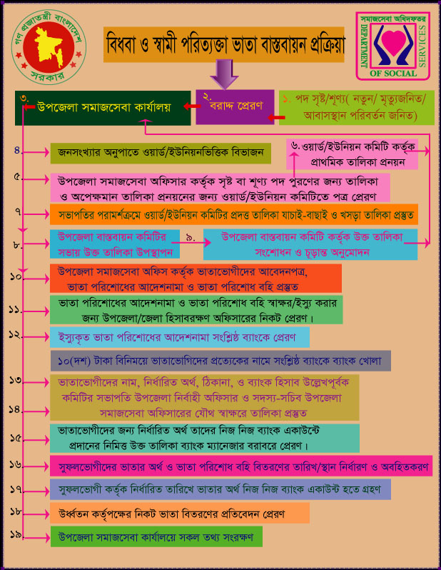 | বিধবা ও স্বামী নিগৃহীতা দুঃস্থ মহিলা ভাতা | মাসিক জনপ্রতি ৫০০/-টাকা করে বিধবা ও স্বামী নিগৃহীতা দুঃস্থ মহিলা ভাতা প্রদান। | ক) বিধবা ও স্বামী নিগৃহীতা দুঃস্থ মহিলা খ) বার্ষিক মাথাপিছু পারিবারিক আয় ১২০০০/- টাকার কম গ) ন্যূনতম বয়স ১৮ বছর